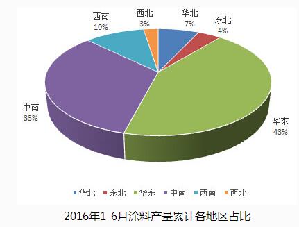 數據顯示,在上半年的涂料產量上,華東地區產量占比最大,達43.10%;中南、西南、華北、東北和西北產量依次占比達33.28%、10.18%、6.97%、3.97%和2.50%。增幅最大的地區是西北地區和中南地區,并有推斷,這與甘肅與海南的增幅相對較大有關。