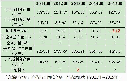 廣東涂料產量、產值與全國總產量、產值對照表(2011年--2015年)