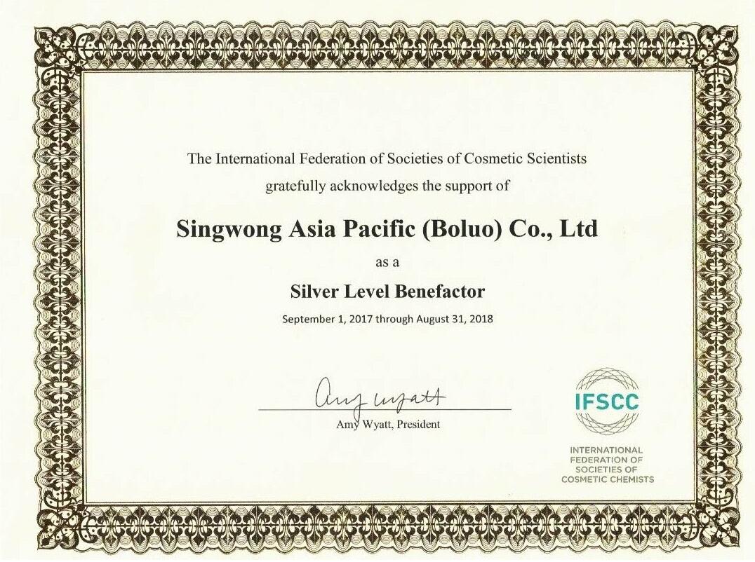 熱烈慶祝星皇集團旗下獨資控股的化妝品公司——星皇亞太企業(博羅)化工有限公司榮獲IFSCC國際化妝品化學師協會聯合會(簡稱IFSCC)Benefactor會員榮譽。