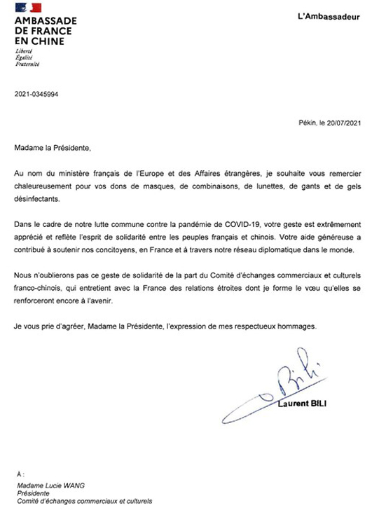 星皇集團贊助防疫物資,法國大使館發來感謝信!